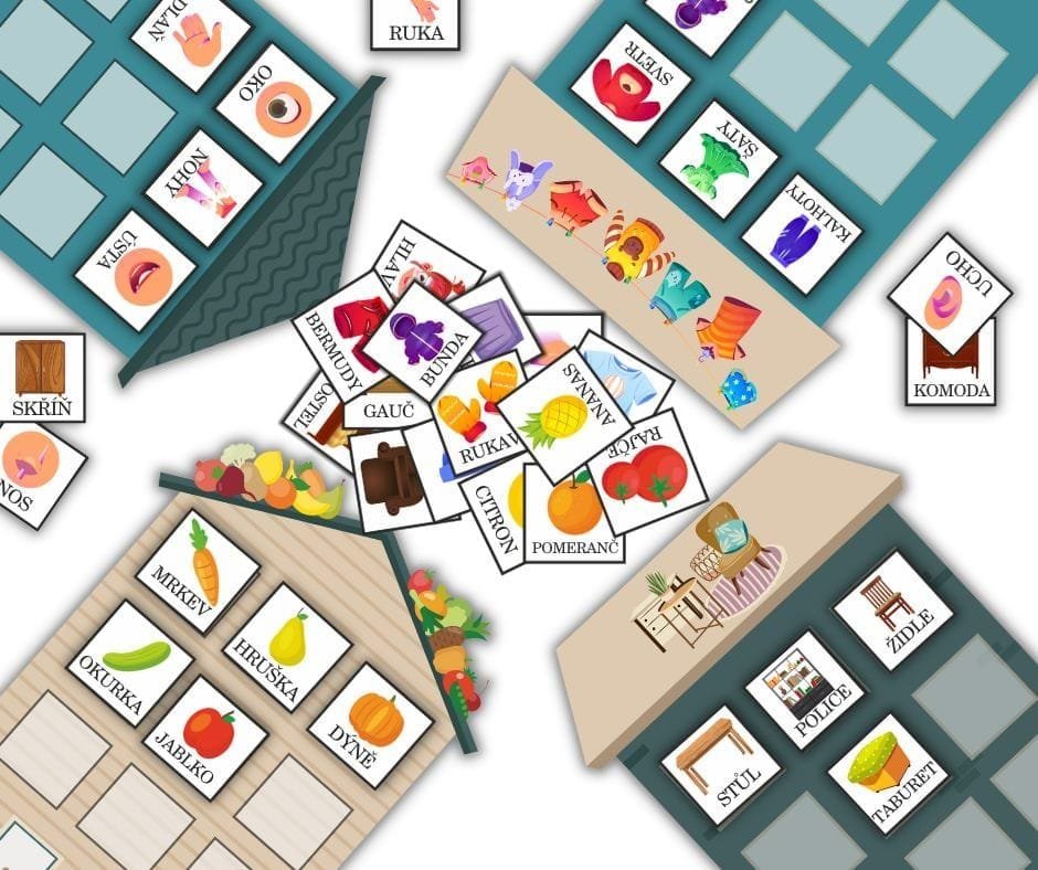 I Učení může být zábava! Zkuste si zahrát hru „Řekni, kam to patří“. Obsahuje 4 barevné plakáty (ovoce a zelenina, oblečení, části těla a nábytek) a 36 obrázkových karet. Pravidla jsou jednoduchá: hráč si vezme kartu, řekne slovo napsané na ní nahlas a kartu uloží do správného domečku. Skvělý způsob, jak si procvičit slovní zásobu a třídění podle jasných kritérií!