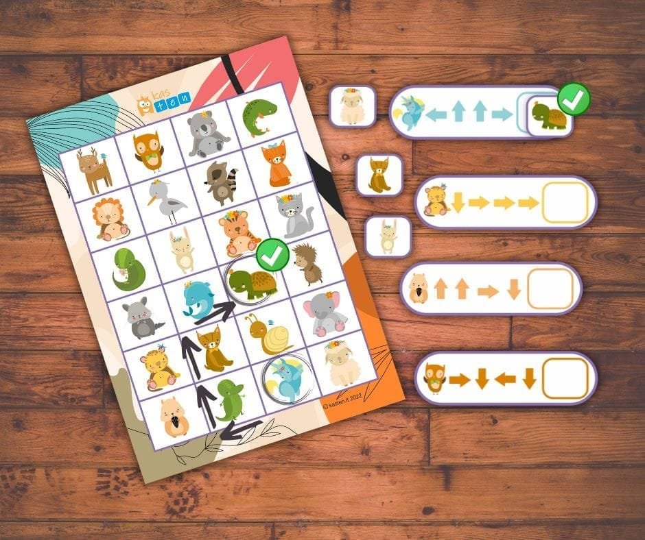 Vydejte se s touto zábavnou hrou za dobrodružstvím se zvířaty! ➡️⬅️⬆️⬇️ Vaším úkolem je najít ztracená zvířata podle šipek na herních kartách. Princip je jednoduchý: vyberte si kartu, najděte zvíře v tabulce a podle šipek objevte další. Tato hra zdokonaluje schopnost řešit problémy a rozpoznávat zvířata.