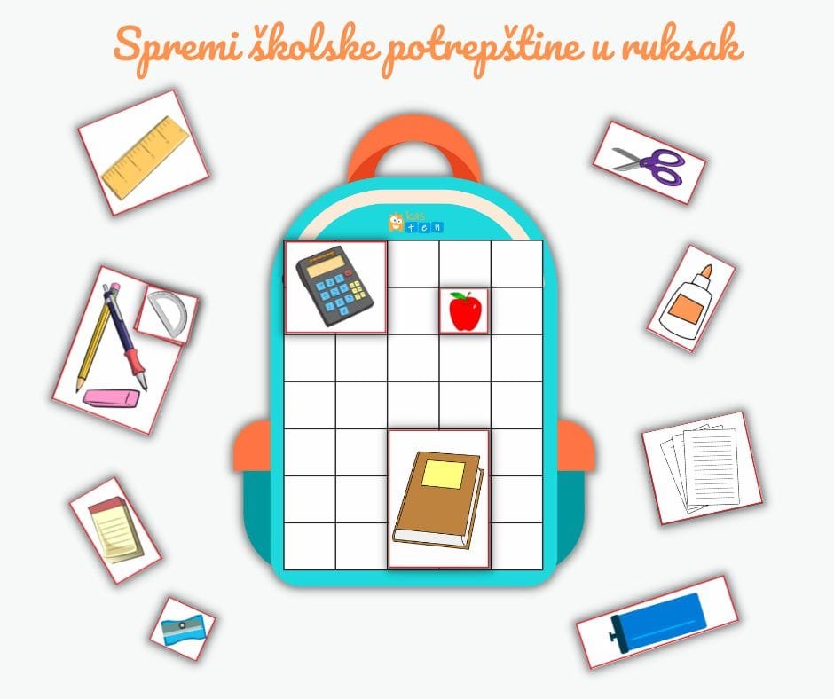 Pripremi se za školu! Ova zabavna i edukativna aktivnost pomaže djeci zapamtiti koje su im stvari potrebne za školu te razvija logičko i prostorno razmišljanje. Dijete mora posložiti sve školske potrepštine u ruksak tako da sve stane – kao u slagalici!