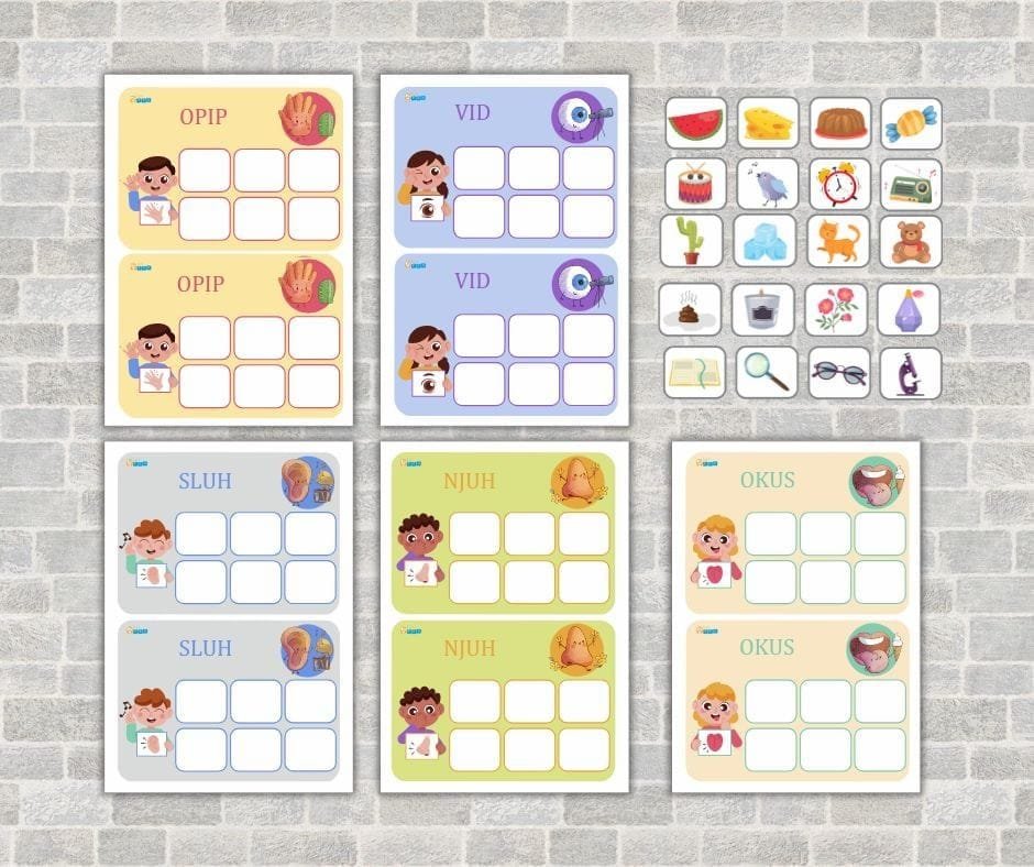 Sadržaj: 8 listova A4 formata. Predlošci za pet ljudskih osjetila: vid, sluh, miris, okus i dodir i 60 slika o osjetilima.