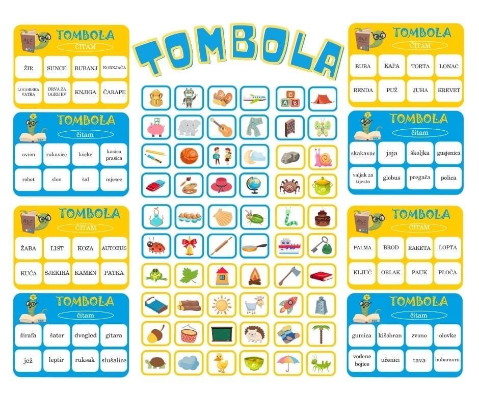 Sadržaj: osam osnovnih kartica za tombolu s riječima, 60 kartica sa slikama i sedam listova A4 formata.