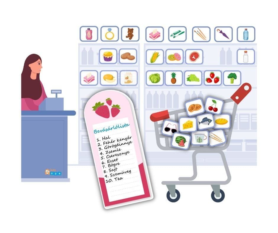 Tedd élvezetessé az olvasást ezzel az interaktív vásárlós játékkal! A gyerekek elolvassák a bevásárlólistát, majd versenyt futnak, hogy megtalálják a megfelelő termékkártyákat, és megtöltsék a bevásárlókocsit. Kiváló egyéni vagy csoportos játéknak is! Remek lehetőség az olvasási készségek fejlesztésére játékos formában.