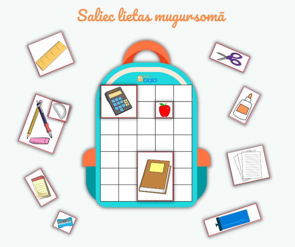 Sagatavojies skolai! Šī jautrā un izglītojošā aktivitāte palīdz bērniem atcerēties, kādas lietas vajadzīgas skolai, un attīsta loģisko un telpisko domāšanu. Bērnam jāsaliek visas skolas lietas mugursomā tā, lai viss ietilptu – gluži kā puzlē!