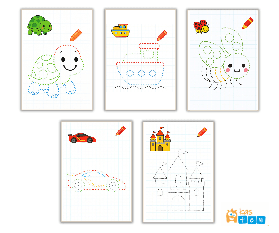 Šajā uzdevumā bērni vispirms zīmē attēlus pa punktētajām līnijām, bet pēc tam tos izkrāso savās iecienītākajās krāsās. Šis materiāls attīsta sīko motoriku, roku un acu koordināciju, kā arī uzmanības koncentrēšanu.