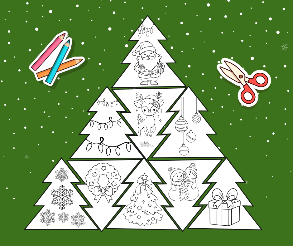 Radošs Ziemassvētku uzdevums, kur bērni izgriež eglītes formas detaļas, tās izkrāso un saliek vienā skaistā svētku kompozīcijā.