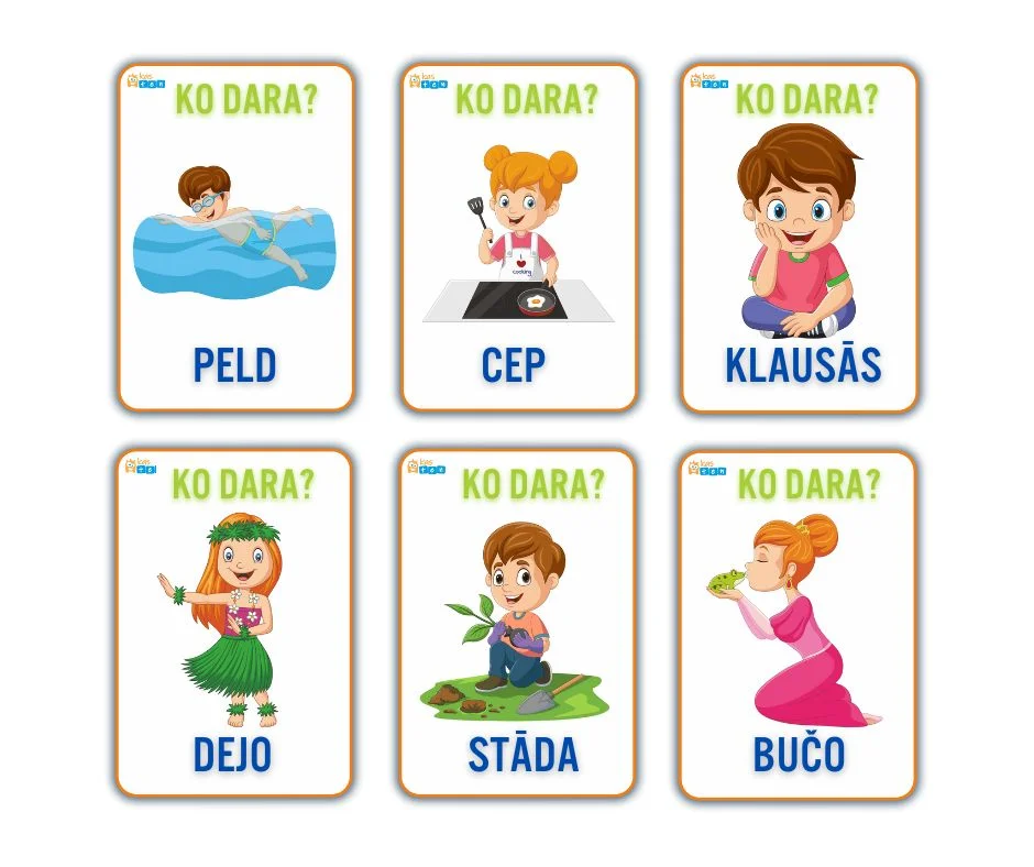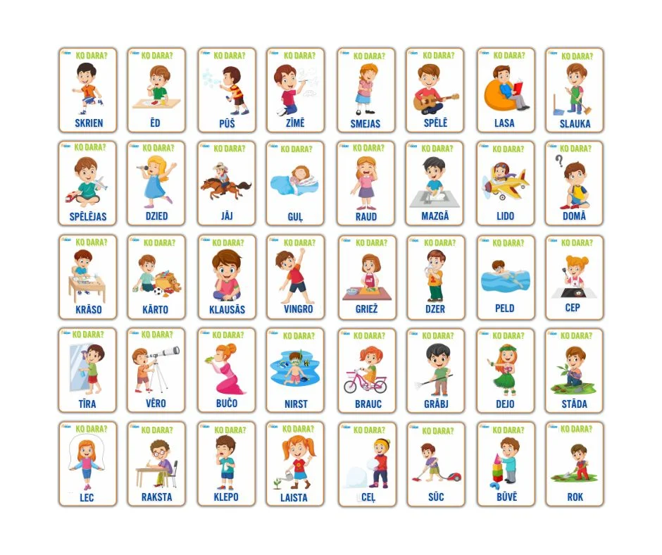 Pajautājiet, ko dara kartīšu varoņi – bērni labprāt nosauks, ko viņi redz, izmantojot darbības vārdu.