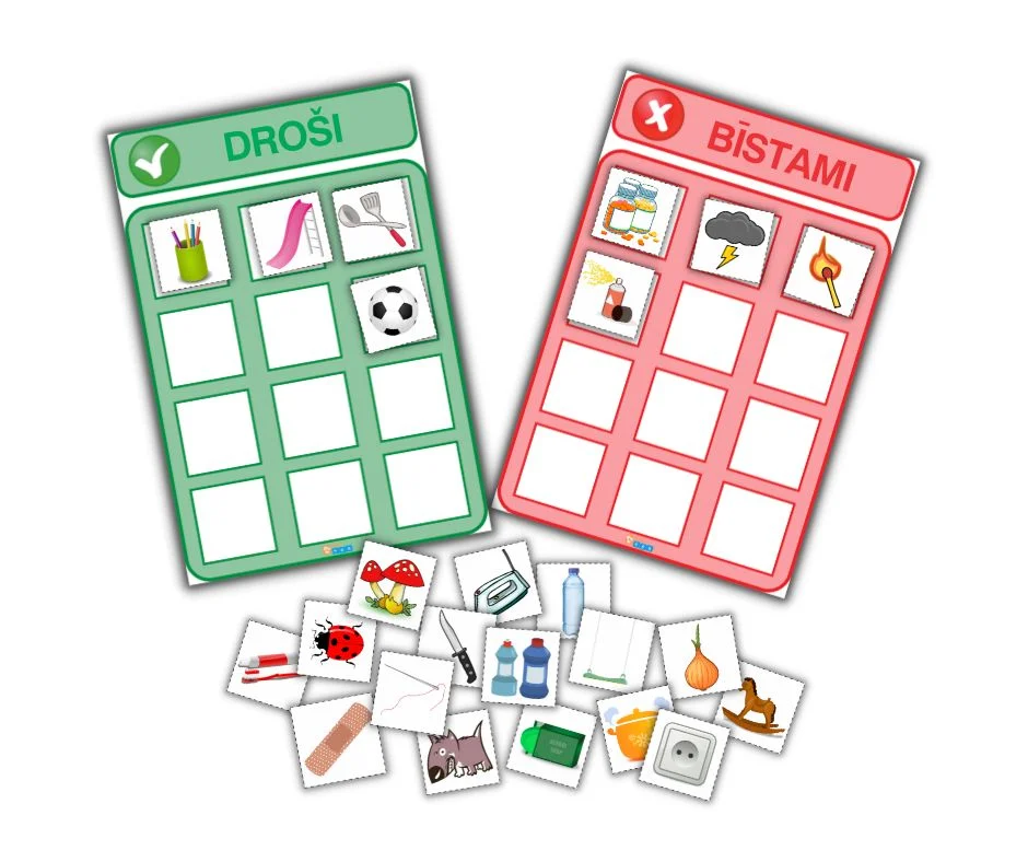 Komplektācija: „Droši un bīstami” plakāti – 2 lapas; drošu un bīstamu situāciju kartītes – 2 lapas; drošas rīcības noteikumu atgādinājums – 1 lapa.