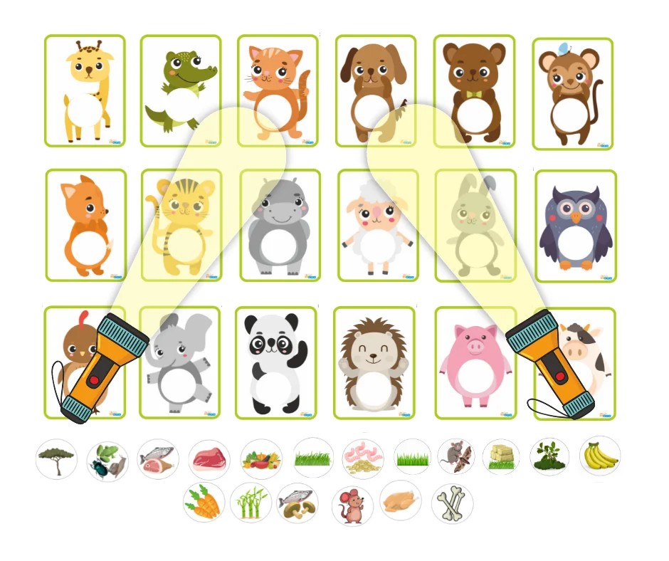 Šī spēle palīdzēs bērniem viegli apgūt dzīvnieku barības devas. Salīmējiet kopā dzīvnieku un to barības devu lapas (dzīvnieki – augšā, barības devas – apakšā) un apgaismojiet ēdienu ar lukturīti no apakšas.