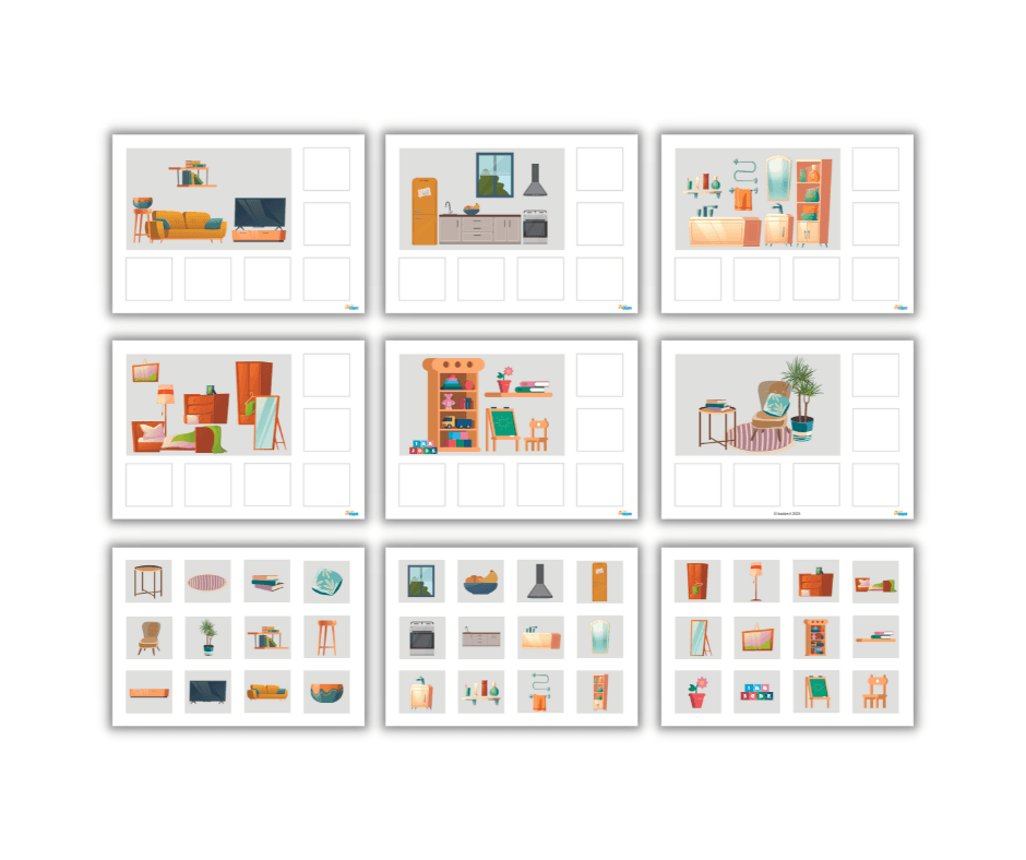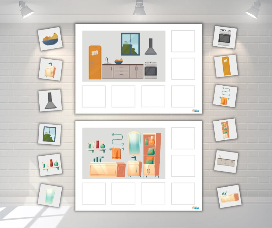 Priekšmeti ap mums – bērnu uzdevums ir izvietot istabas mēbeles un citus priekšmetus tiem paredzētās vietās.