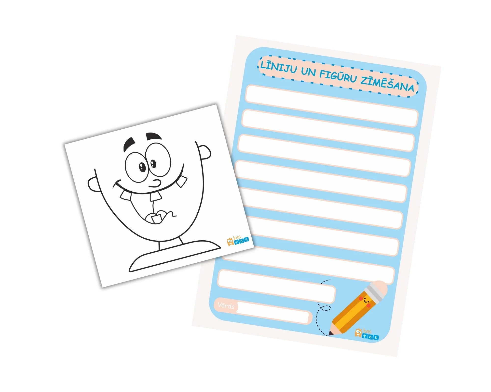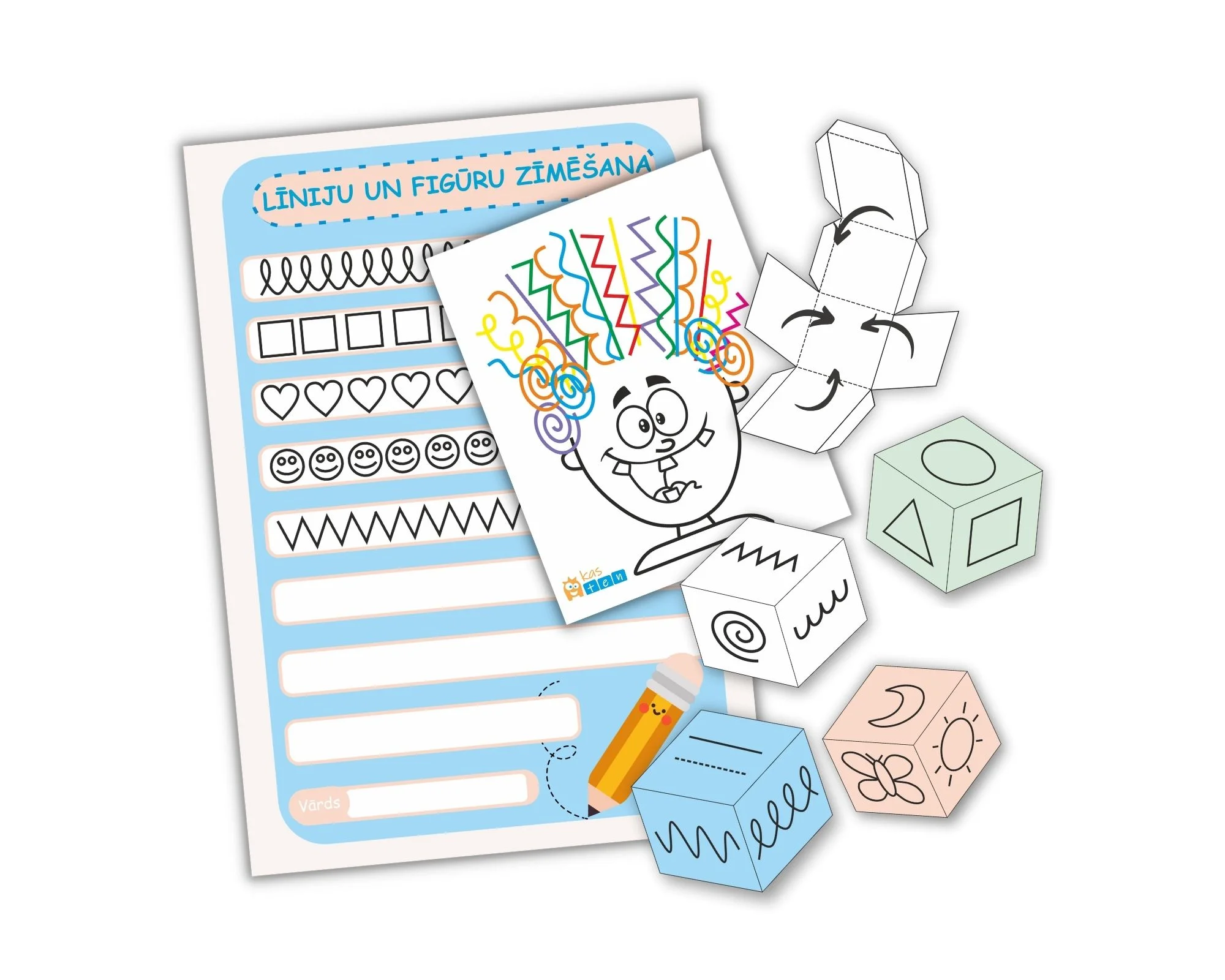„Līniju un formu zīmēšanu” veido divi uzdevumi. Pirmajā uzdevumā ir trīs krāsaini metamie kauliņi un lapa līniju, formu un attēlu zīmēšanai. Otrajā – balti spēļu kauliņi ar dažādām līnijām un lapa ar jautru sejiņu. Izdrukājiet visas uzdevuma lapas. Izgrieziet metamo kauliņu sagataves un salīmējiet, lai iegūtu kubus.