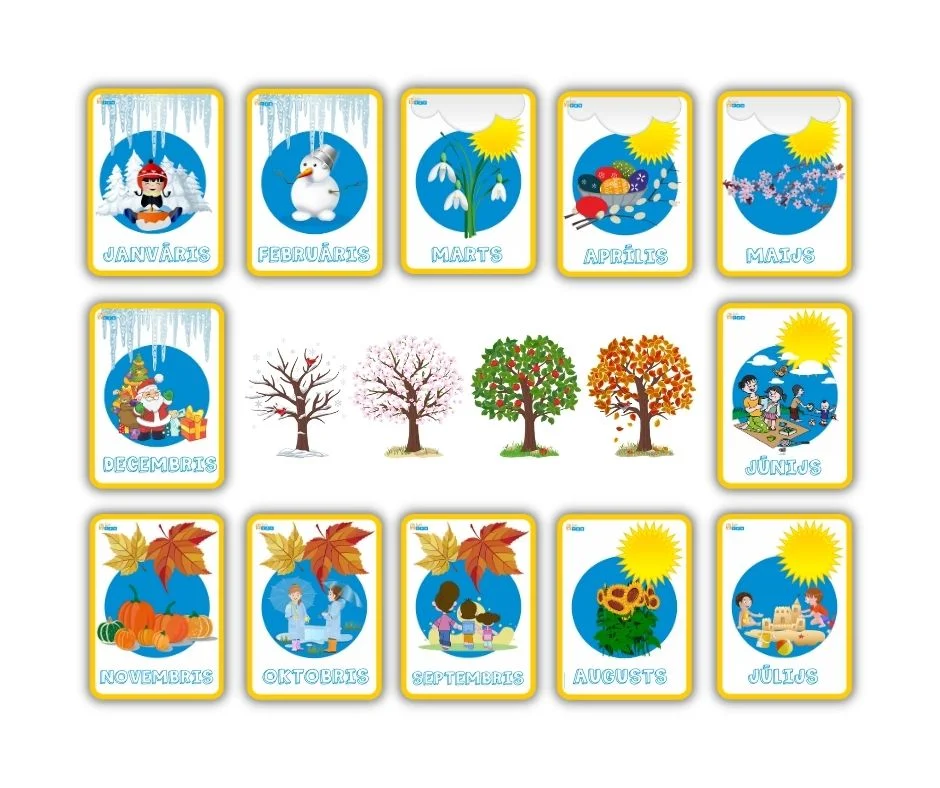 Šim uzdevums ļaus bērnam ātri iemācīties un atcerēties mēnešu nosaukumus, to secību, kā arī piešķirt tos attiecīgajam gadalaikam. Katrā kartītē ir mēneša nosaukums un attēli, kas saistīti ar šo mēnesi. Padariet mācīšanos jautrāku!