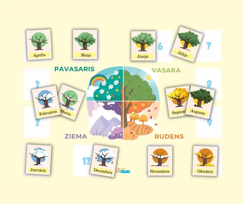 Pateicoties šim uzdevumam, bērns ātri iemācīsies un atcerēsies mēnešu nosaukumus, to secību un piešķirs tos gadalaikiem. Katrā kartītē ir mēneša nosaukums un attēli, kas saistīti ar šo mēnesi. Lai mācīšanās būtu jautrāka!