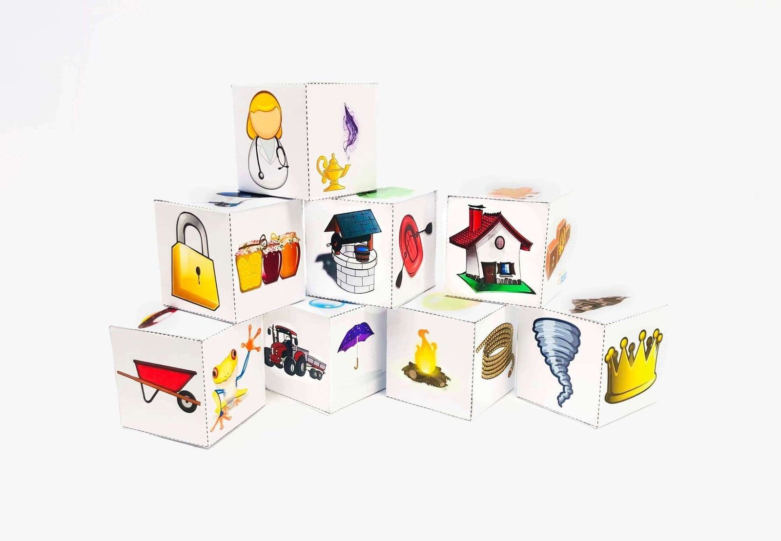 Podporte kreativitu a komunikačné zručnosti detí touto zábavnou príbehovou hrou! Hádžte 8 kockami s rôznymi obrázkami a zo všetkých hodených obrázkov zostavte vlastný príbeh. Ide o ideálny spôsob rozvoja jazykových zručností a dokonca aj učenia sa cudzích jazykov. Či už rozprávate celý príbeh, alebo sa pri každom obrázku striedate, táto hra predstavuje skvelý spôsob, ako zaujať mladú myseľ!