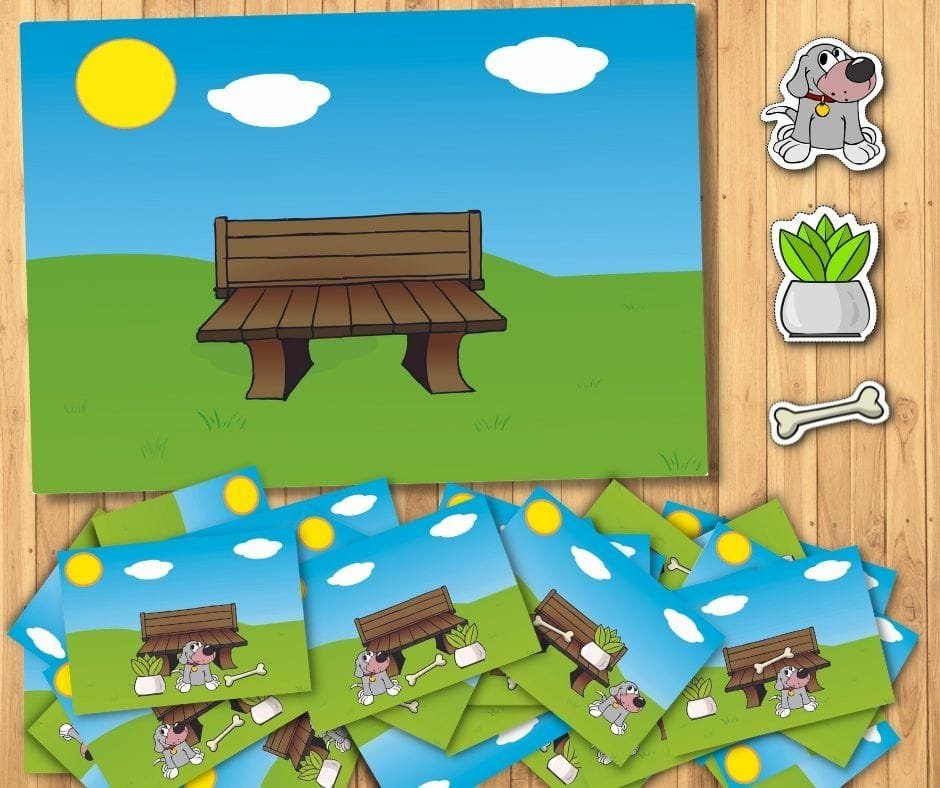 Na obrázkových kartách sú znázornené rôzne miesta, kde sa nachádza šteniatko Pukas, jeho kosť či rastlina, napríklad na predmetoch, blízko nich či pod nimi. Hráči si krátko prezrú kartu a potom musia scénu opäť vytvoriť z pamäti a nahlas ju opísať. Ide o skvelý spôsob, ako si zlepšiť pamäť, jazykové zručnosti či cit pre detail!