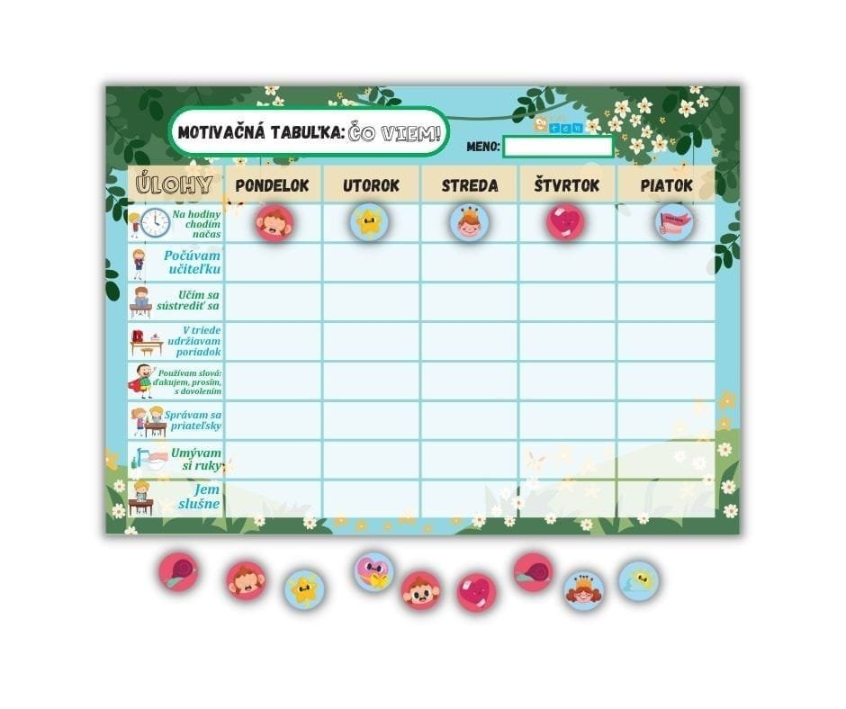 Obsahuje dve tabuľky s úlohami (pre chlapcov a dievčatá) a tretiu tabuľku na zapisovanie povinností, ktoré si sami vymyslíte.