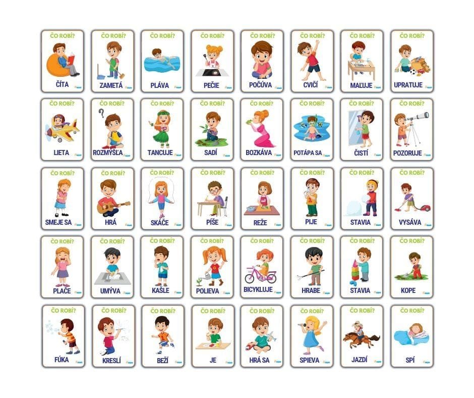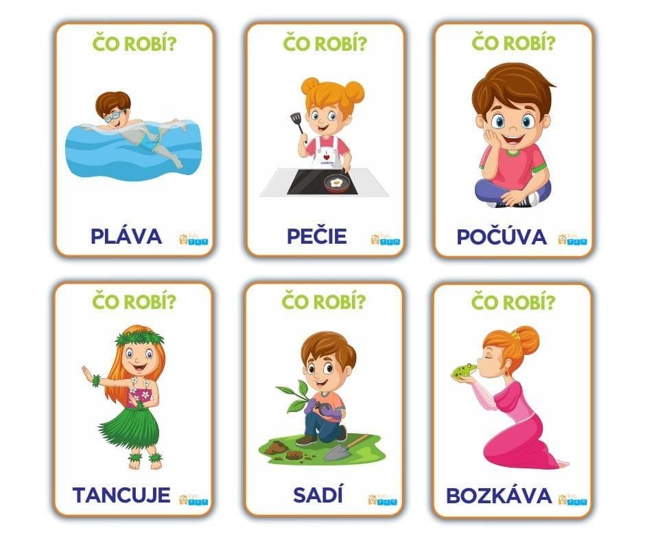 Spýtajte sa, čo robia hrdinovia na kartách, a deti s radosťou pomenujú správnym slovesom to, čo vidia.